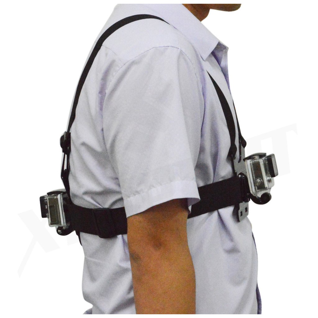 Univerzální držák 2v1 na prsa / hrudník / záda pro kamery GoPro. Jedno z nejpopulárnějších příslušenství pro kamery GoPro. Používají ho zejména lyžaři, cyklisty, motorkáři a další sportovci. Záběr je z nižší části těla než je hlava, proto máte v záběru například ruce, řidítka a záběry tak dostávají uplně nový rozměr. Druhá kamera na zádech může natáčet pohyb za vámi.