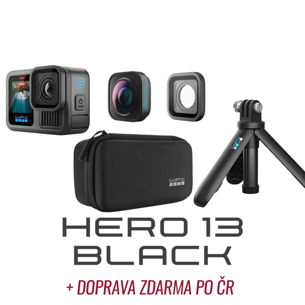 Tato obsahuje GoPro HERO13 Black s ultra širokým modulárním objektivem pro širokoúhlé pohlcující záběry s vylepšenou stabilizací videa HyperSmooth.
