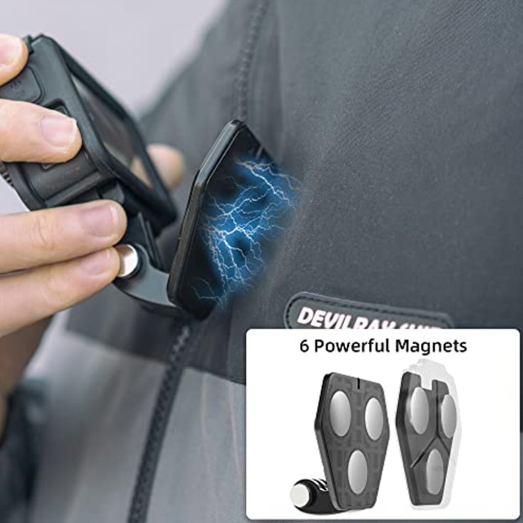 - Magnetický držák lze použít přes oblečení, batohy nebo přímo připevnit na železné povrchy, ledničky atd.